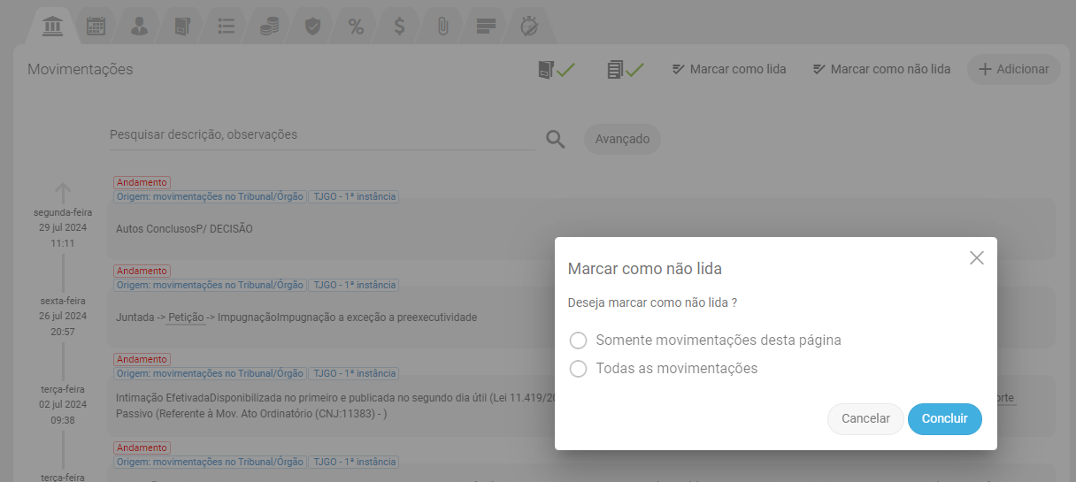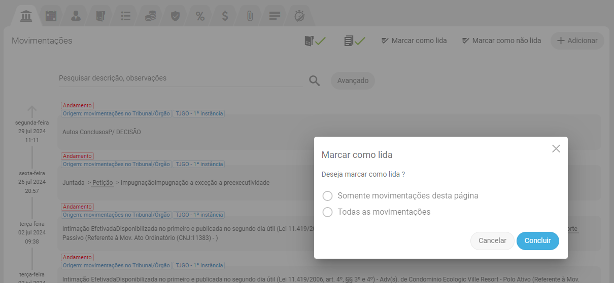 Se clicar em Marcar como lida ou Marcar como não lida, uma nova tela irá se abrir para que você defina se deseja marcar como lida todas as movimentações ou somente as daquela página.
