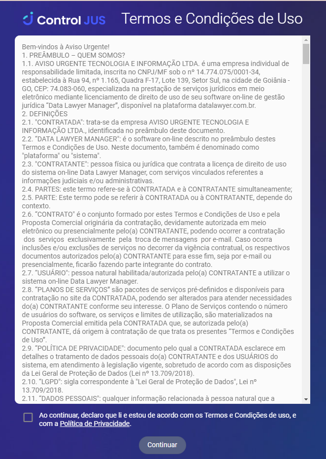 Em seu primeiro acesso, é obrigatório aceitar os termos e as condições de uso e também a política de privacidade.
