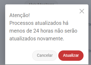 Ao confirmar em "Atualizar" a busca será refeita, atualizando as informações de capa das fontes disponíveis e trazendo novas fontes quando existirem. Essa atualização em lote não é direcionada para a Central de Processamento. Por se tratar de um fluxo ágil, os processos são rapidamente encaminhados para a aba "Em processamento" e, quase de forma instantânea, retornam atualizados para a aba "Processada".
