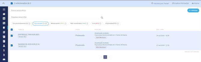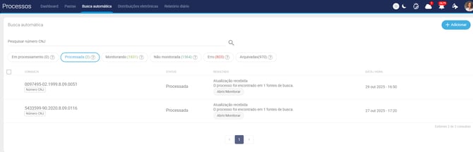 Ao confirmar em "Consultar" os processos são encaminhados para a aba "Em processamento" e a busca das informações da capa do processo e dos andamentos disponíveis na consulta pública será refeita.