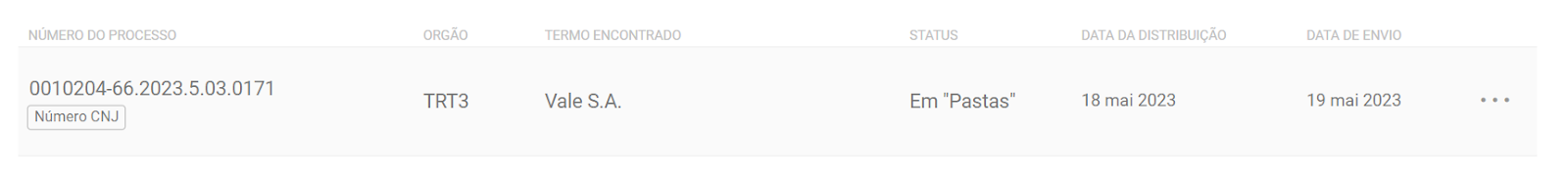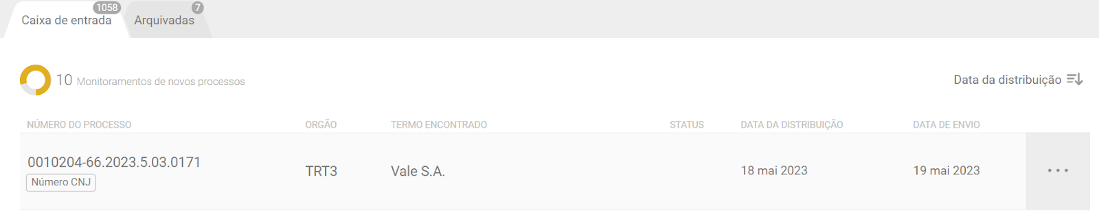 Para adicionar uma distribuição eletrônica a uma pasta vá no módulo Processos > Distribuições eletrônicas e posicione o mouse sobre a distribuição desejada, o ícone dos três pontos será exibido.