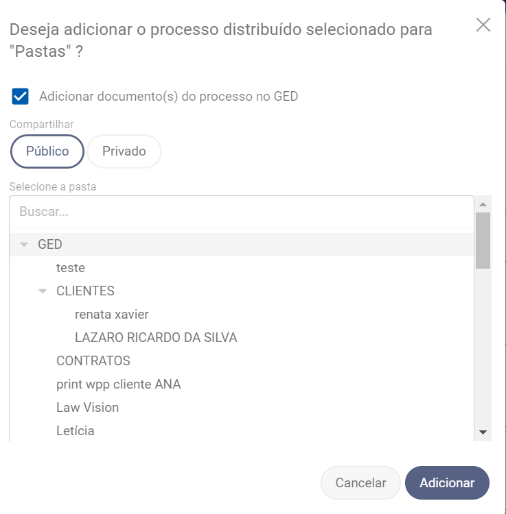 Você pode escolher se os documentos serão compartilhados de forma pública ou privada e se deseja adicioná-los no GED ou em alguma pasta dentro do GED. Por fim, clique em Adicionar.