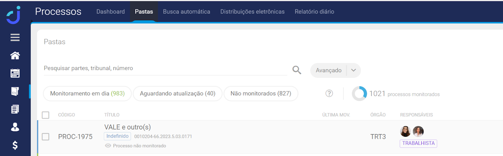 Para verificar, vá na aba Pastas e veja que o processo foi criado: