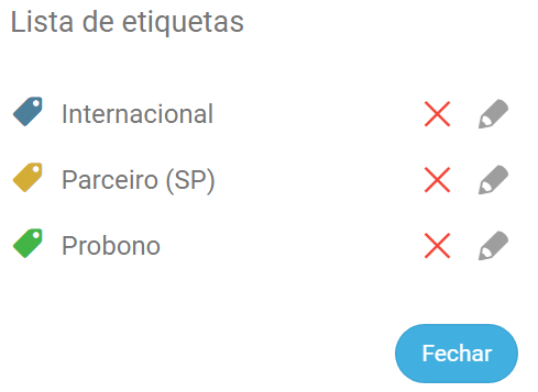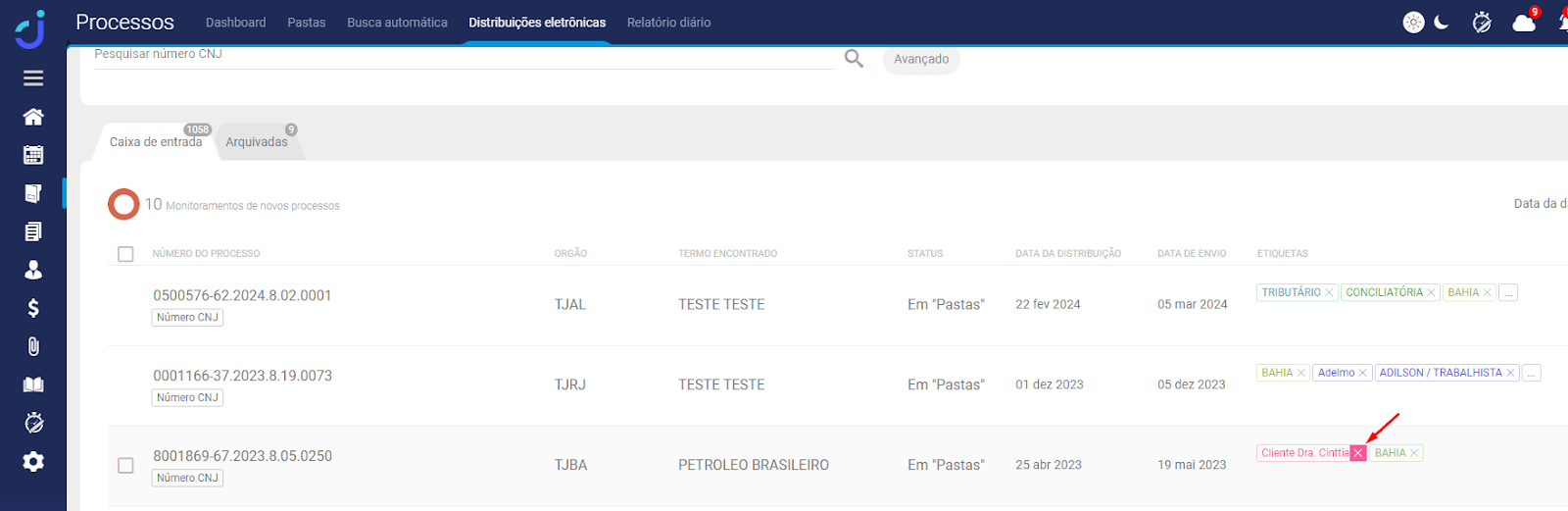 Para alterar ou excluir vá no módulo de Processos > Distribuições eletrônicas > escolha um processo e posicione o mouse sobre o ícone > Adicionar etiqueta > clique no símbolo do