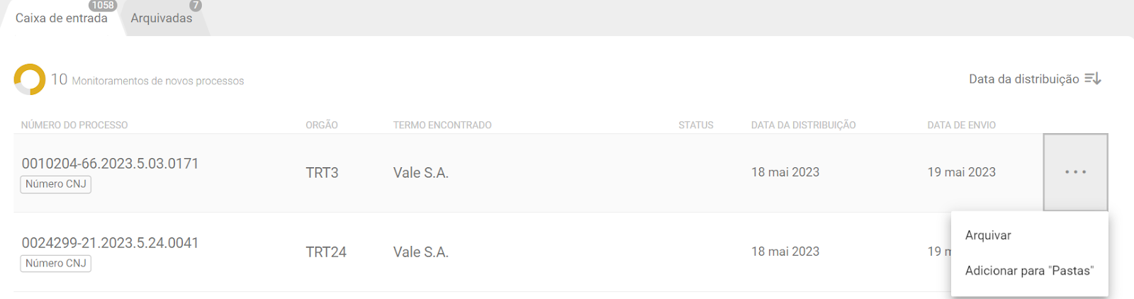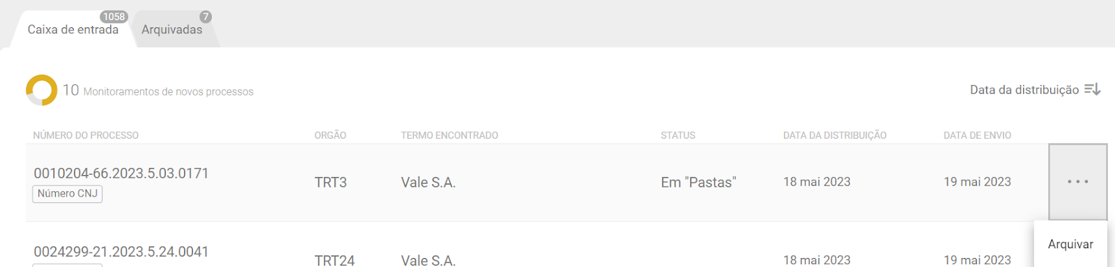 Clique em Arquivar e o processo será movido para a aba Arquivadas.