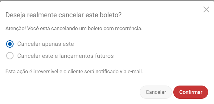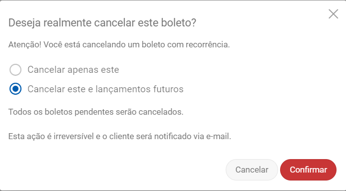 Se escolher a opção Cancelar este e lançamento futuros uma mensagem de alerta logo abaixo da opção será exibida: Todos os boletos pendentes serão cancelados.