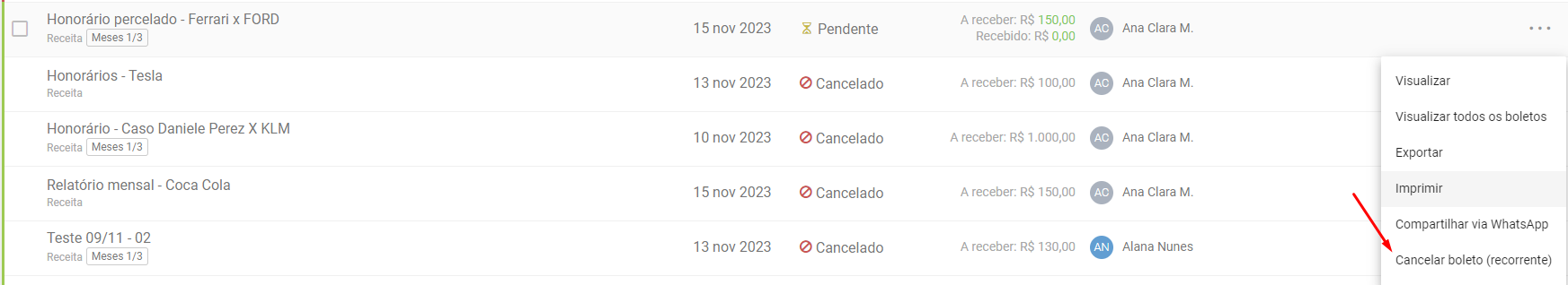 Para cancelar um boleto com recorrência que estão pendentes, vá no lançamento desejado e clique no ícone dos três pontos e escolha a opção Cancelar boleto (recorrente).