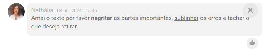 Caso deseje, é possível definir o alinhamento, negritar, sublinhar, tachar e deixar em itálico. Para inserir o comentário clique no ícone da seta ou dê Enter.