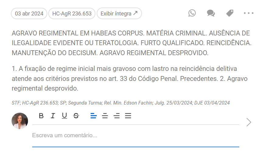 Para comentar um julgado, vá no módulo Acervo Jurídico > Jurisprudência identifique a jurisprudência desejada > clique no ícone do balão > surgirá um campo para inserir o seu comentário.