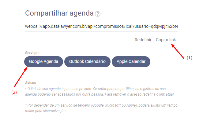 Em seguida copie o link da sua agenda (1) e clique no botão da Google Agenda (2):