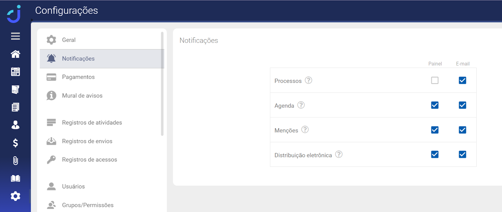 Caso queira, configure seu usuário para receber as notificações de novas distribuições, para isso acesse o módulo Configurações > Notificações > Distribuições eletrônicas.