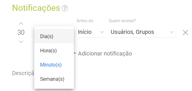 Configure notificações em dias, horas, minutos ou semanas, se deseja receber antes do início do compromisso ou antes do fim e adicione uma ou mais notificações.
