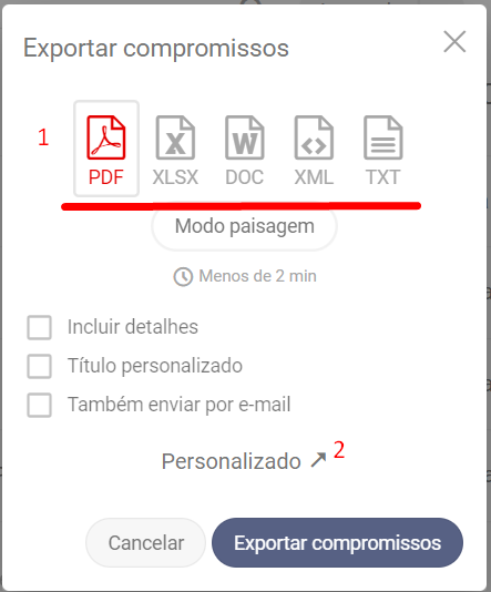 O software permite exportar um relatório de compromissos nos seguintes formatos: