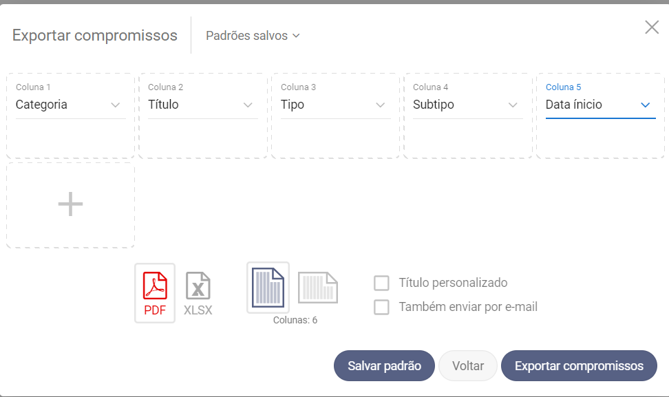 Escolha em cada uma das colunas a informação que deseja para compor o seu relatório. No layout retrato você pode escolher até 06 colunas para o relatório e no paisagem até 09 colunas.