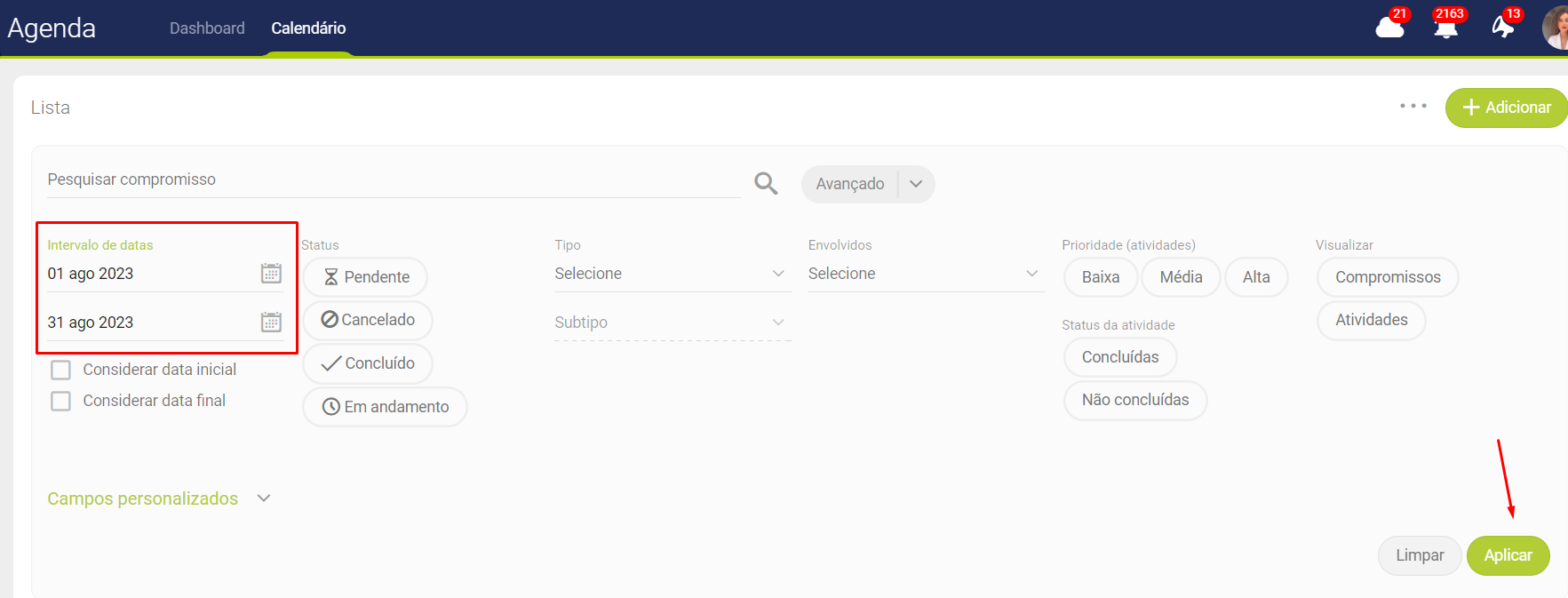 Selecione o intervalo de datas que deseja e/ou outros filtros, então clique em Aplicar.