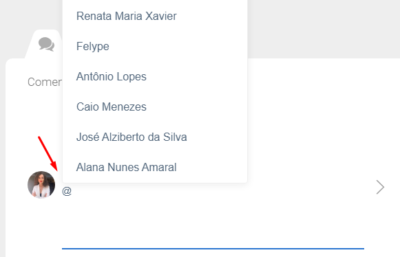 Se desejar adicionar junto ao comentário uma imagem é possível e caso queira fazer uma menção, digite o @ que a lista dos usuários do software vão aparecer, conforme imagem abaixo: