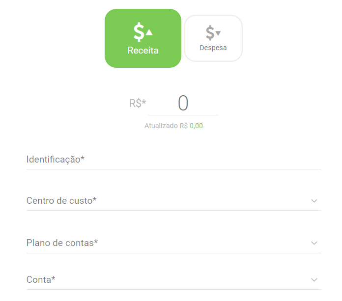 Insira o valor e, em seguida, escreva uma identificação para o lançamento. Depois, selecione o centro de custo, o plano de contas e a conta correspondente.