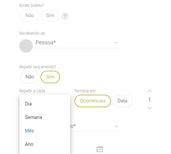 Se o lançamento financeiro for do tipo boleto, selecione "Sim" na opção "Emitir boleto". Caso contrário, apenas prossiga com o cadastro e inclua o contato da pessoa. Além disso, no campo “Repetir lançamento?” clique em sim e defina a forma da repetição, se irá se repetir a cada dia, semana, mês ou ano.