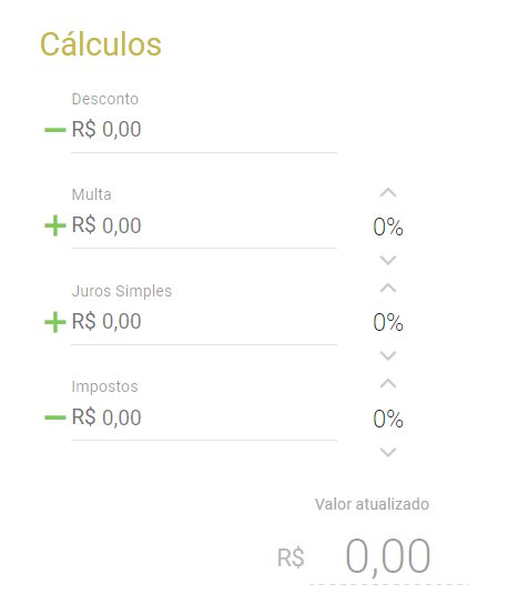 Se o lançamento envolver multa, juros, impostos ou descontos, por favor, insira essas informações nos campos correspondentes em "Cálculos".