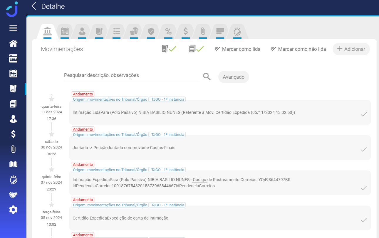 Para fixar movimentações processuais como favoritas, acesse o módulo Processos > Pastas > aba Movimentações.