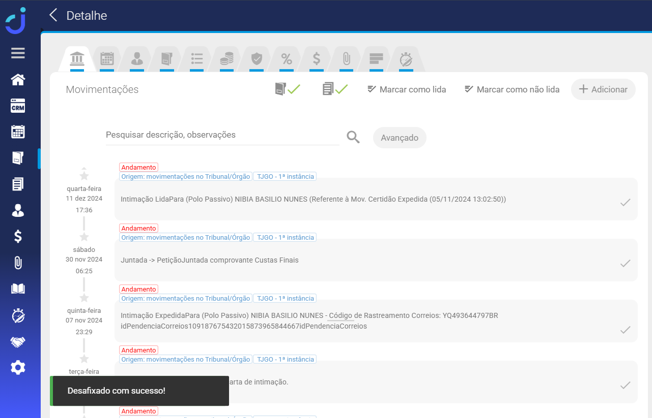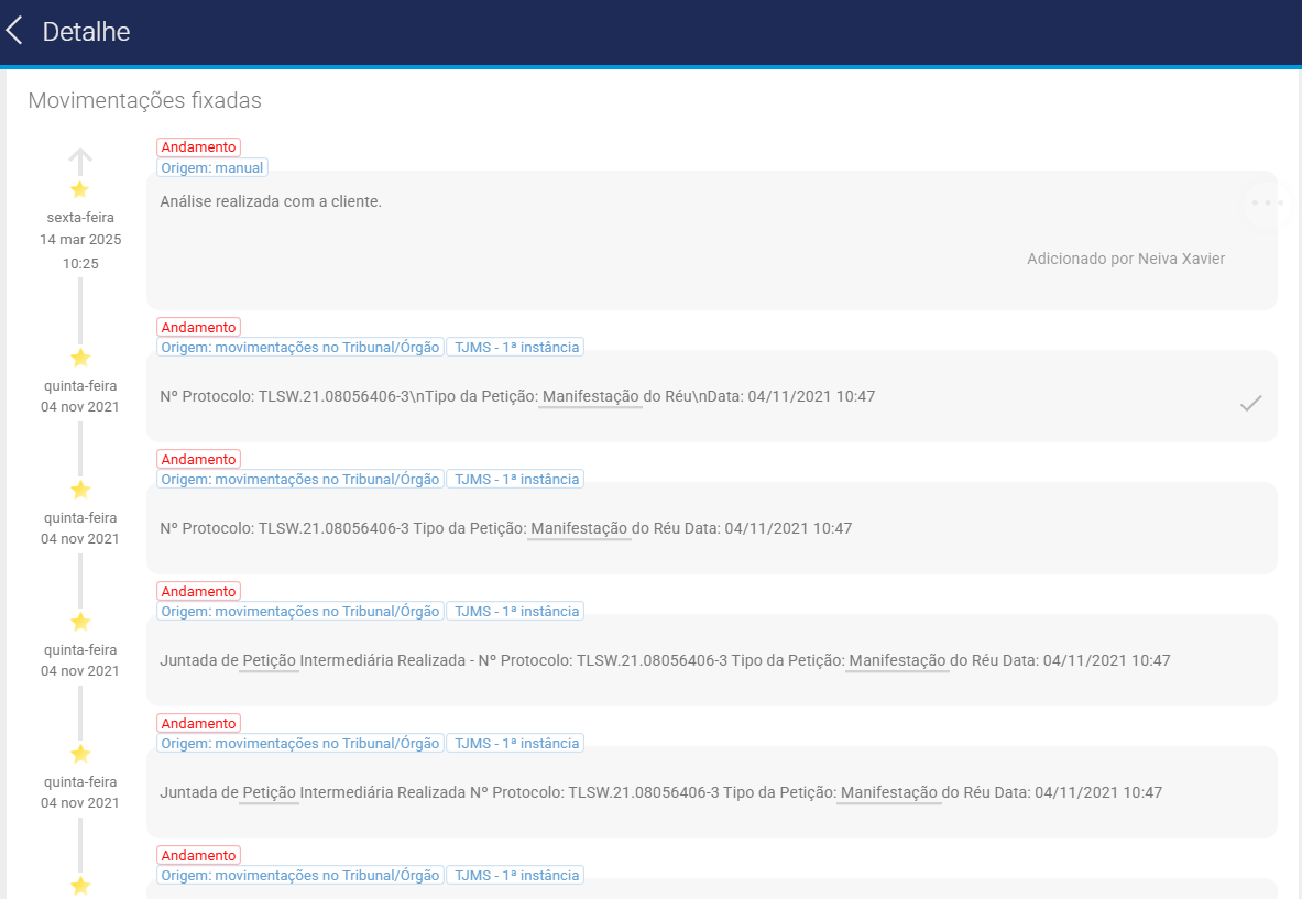 Uma tabela será exibida automaticamente na parte superior da tela, mostrando os andamentos fixados em ordem decrescente.
