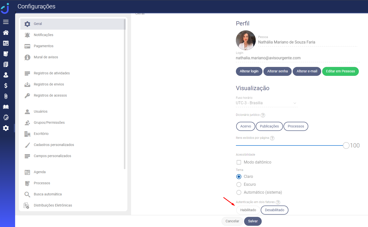 Para habilitar vá em Configurações > Geral > Autenticação em dois fatores > Habilitado.
