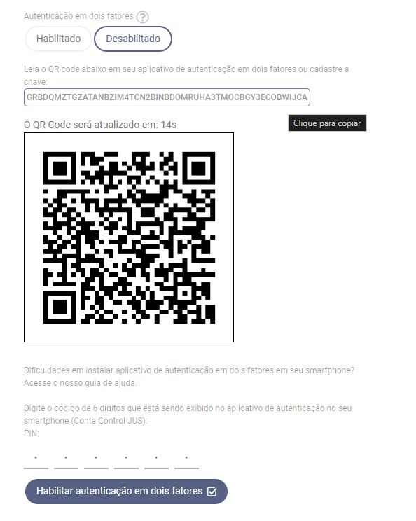 Copie a chave ou leia o Qrcode no aplicativo de autenticação escolhido, insira o código e clique em Habilitar autenticação em dois fatores.