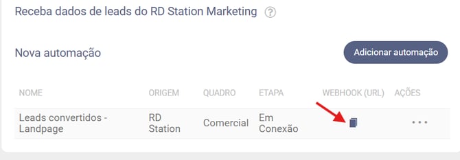 04º Na coluna Webhook (url) clique no ícone de copiar.