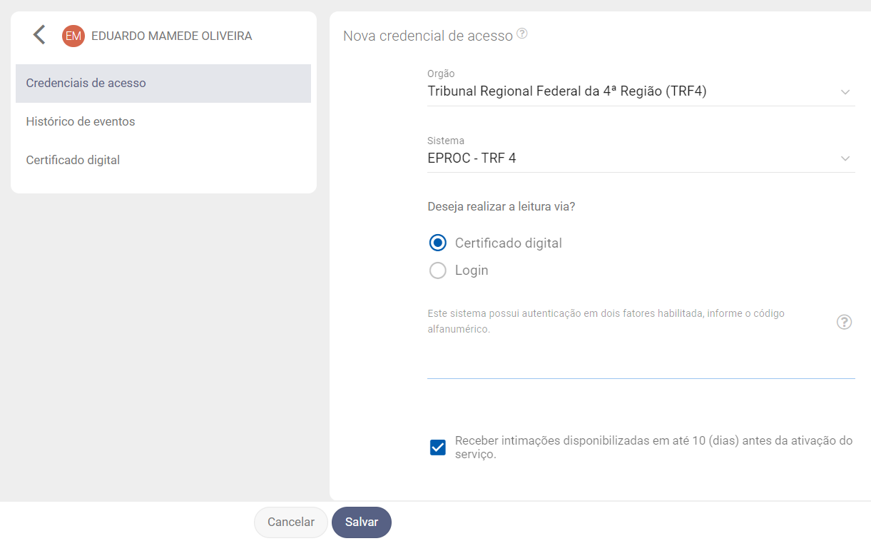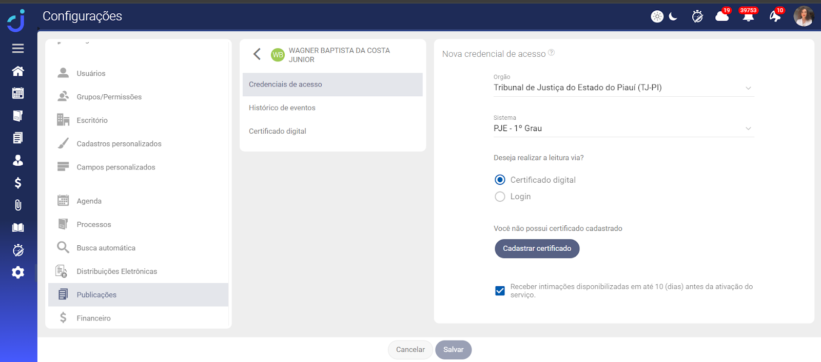 Para realizar o monitoramento via certificado digital A1 vá no módulo de Configurações > Publicações > Nomes pesquisados > Painéis > Credenciais de acesso.