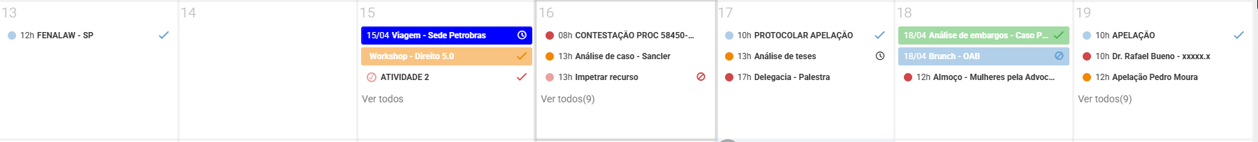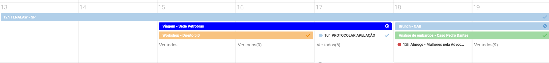 Na versão simples do calendário, a configuração de quantidade de compromissos por dia não é aplicada. Por padrão, são exibidos apenas 4 compromissos. Caso haja mais de 4 compromissos em um dia, apenas os 3 primeiros serão mostrados, e os demais poderão ser acessados clicando em "ver todos".