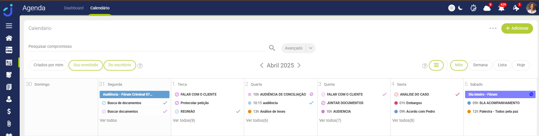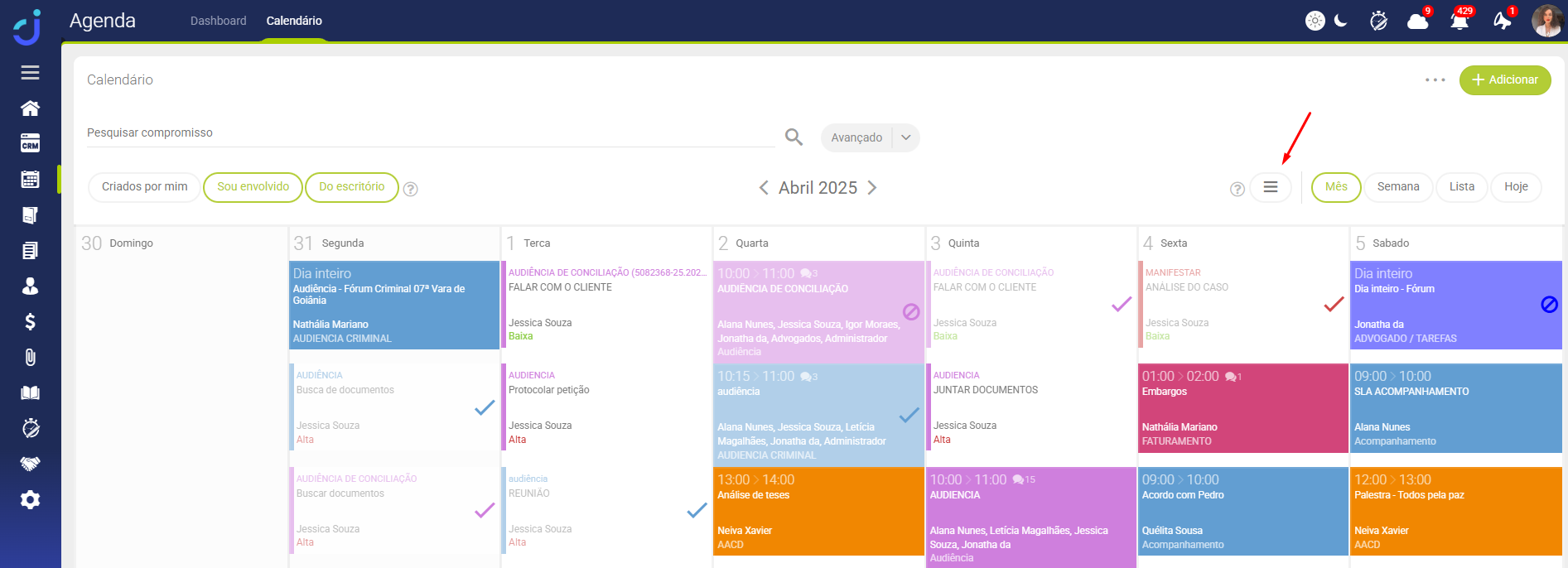 Para acessar o calendário mensal em uma versão simplificada, basta navegar até o módulo Agenda > Calendário e clicar no ícone das três linhas que está localizado ao lado da palavra Mês.