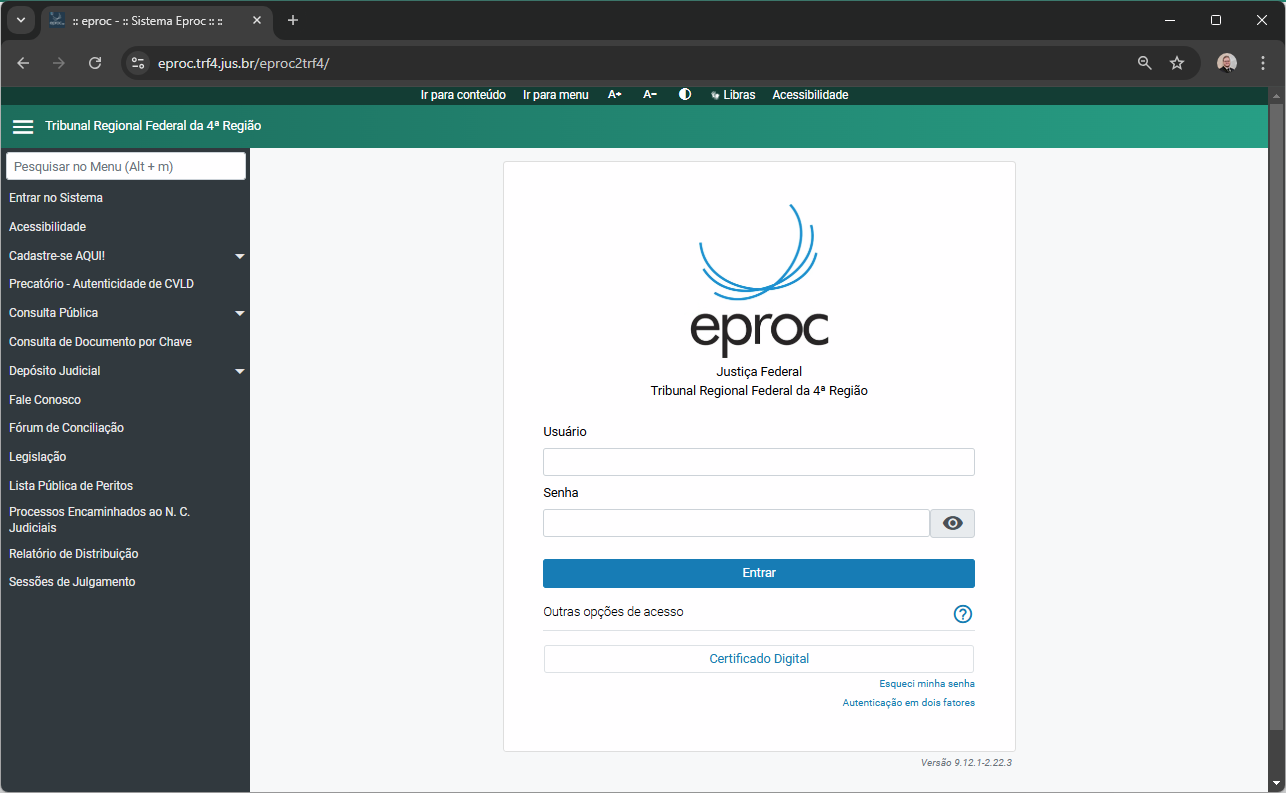- Acessar o site https://eproc.trf4.jus.br/ e clique na opção “Entrar no sistema”.