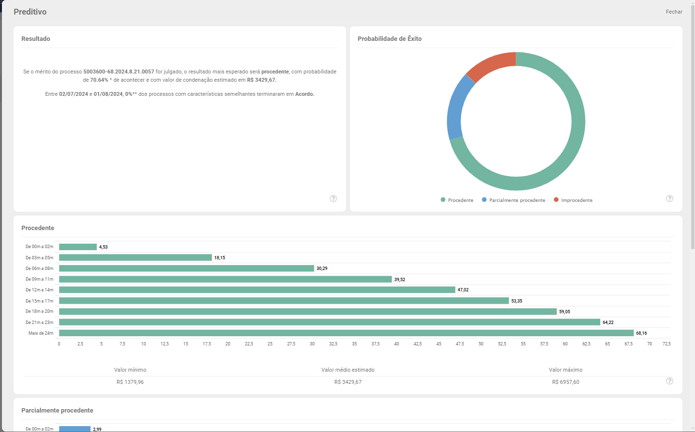 O preditivo é uma funcionalidade que utiliza modelos preditivos para estimar o provável resultado de julgamentos de primeira instância. Isso possibilita a elaboração de estratégias mais eficientes e precisas para acordos, defesas, análise de riscos e rentabilidade do negócio.