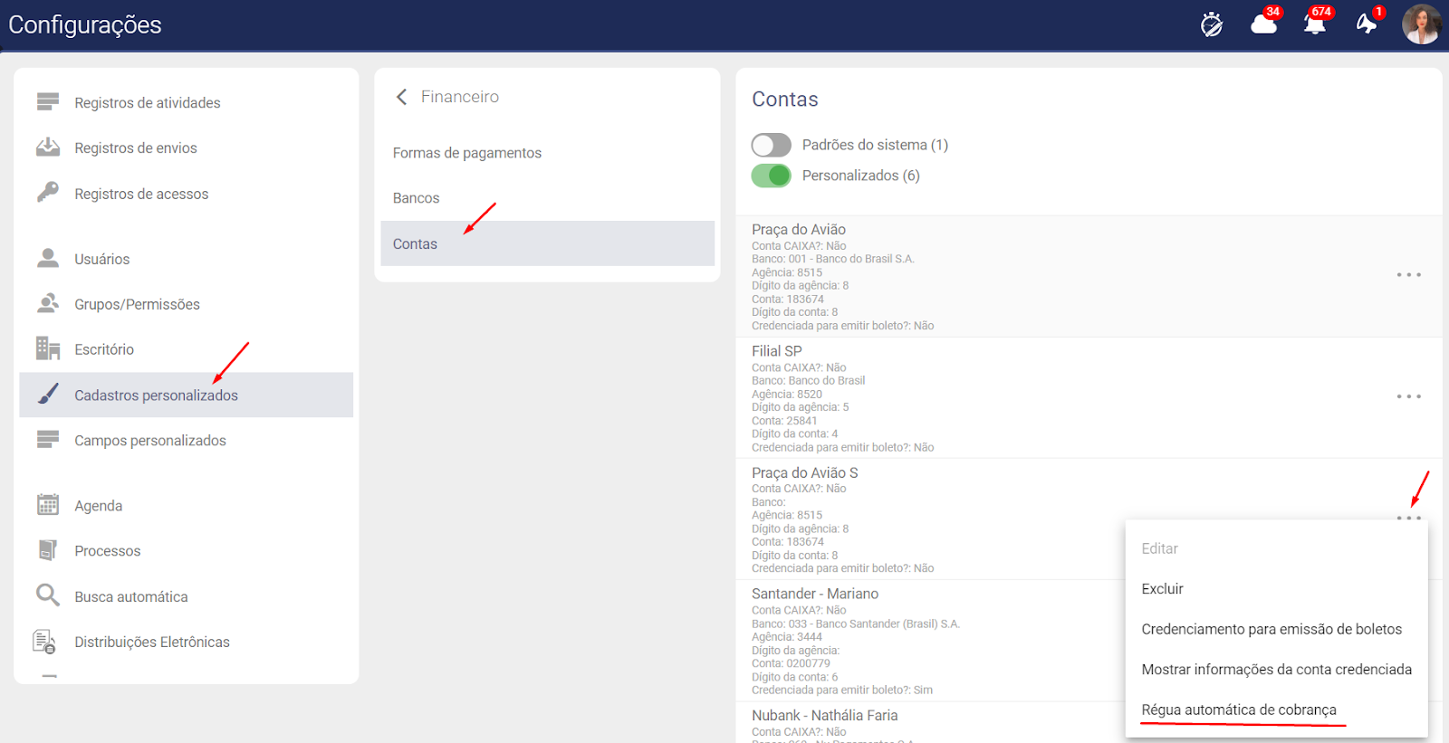 Para habilitar a régua automática de cobrança vá em Configurações > Cadastros personalizados > Financeiro > Contas.