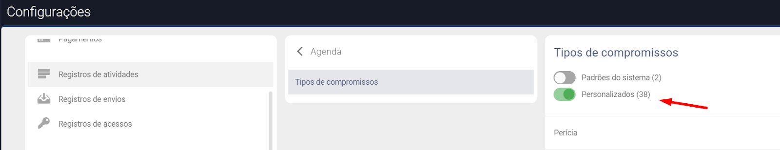 Para adicionar um tipo de compromisso, vá em Configurações > Cadastros personalizados > Agenda > Tipos de compromissos.