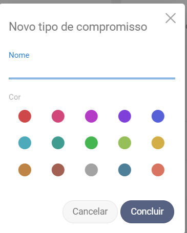 Digite o nome do novo tipo de compromisso, escolha a cor que será exibido na agenda e por fim clique em Concluir.