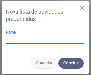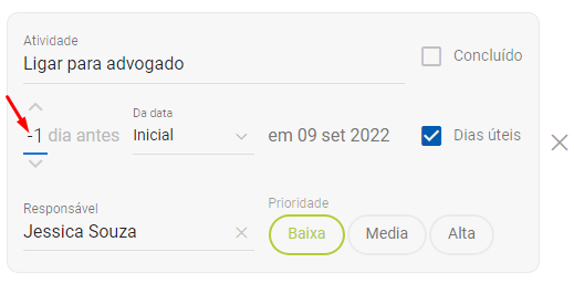 Conforme exemplo acima, informe o nome da atividade, dias de antecedência, responsável* e a prioridade da atividade. Por fim, clique em Concluir.