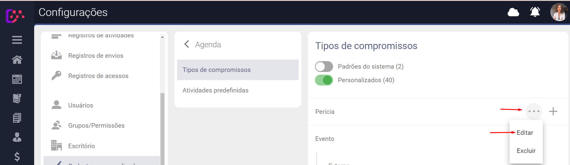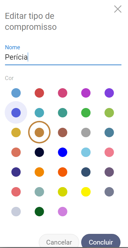 Como alterar a cor de um compromisso na agenda? Para alterar a cor de um compromisso vá no módulo Configurações > Cadastros personalizados > Agenda. Selecione Tipos de compromissos > escolha o compromisso > clique no ícone dos três pontos > Editar. Selecione a cor que deseja > clique em Concluir. Conforme imagem abaixo: