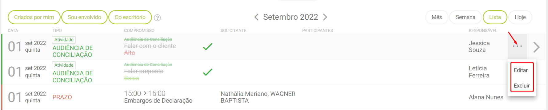 Caso esteja visualizando no modo lista, clique nos três pontinhos e escolha a opção Editar ou Excluir: