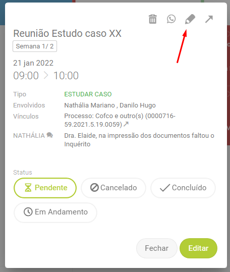 Para editar, clique no compromisso desejado, em seguida clique no ícone do lápis ou no botão Editar.