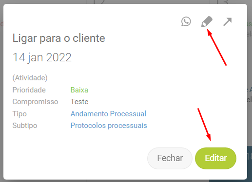Para alterar uma atividade criada, vá no menu Agenda > Calendário > clique na atividade desejada > clique no ícone lápis: