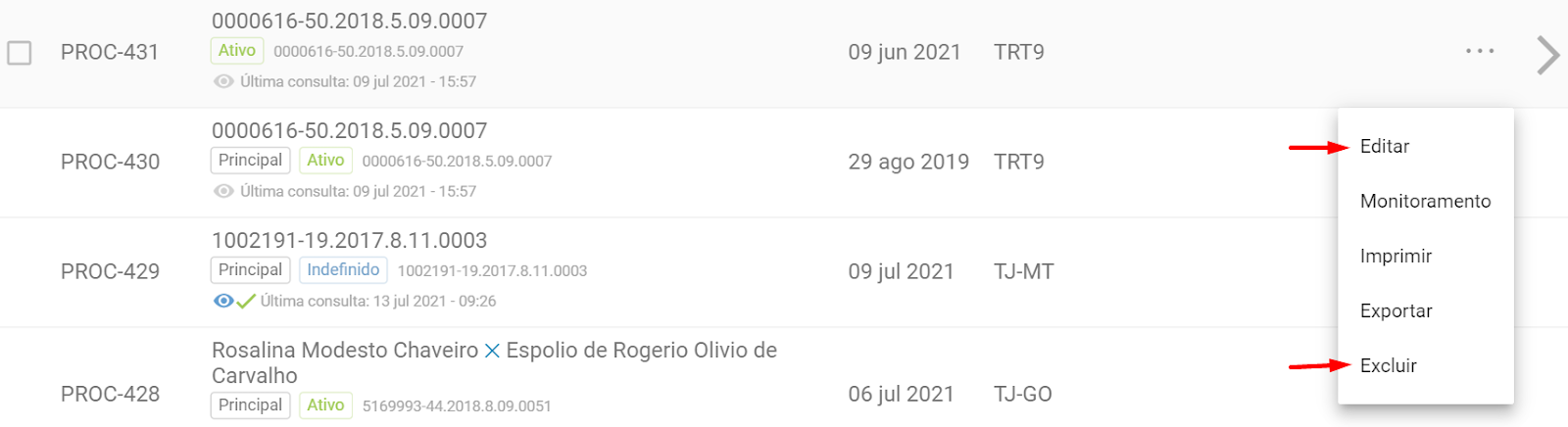 Para alterar/excluir uma pasta de processo vá no módulo Processos > Pastas > clique no ícone