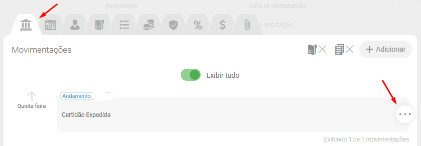 Acesse a pasta de processo, localize o andamento desejado nas Movimentações, clique nos três pontos e selecione Compartilhar Via Whatsapp: