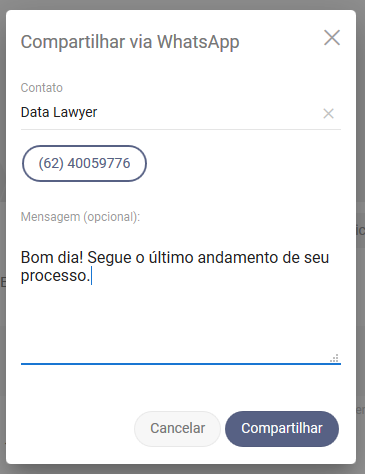 Você também pode enviar os andamentos/movimentações para uma pessoa sem telefone cadastrado no software e que esteja apenas salvo em seu celular.
