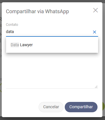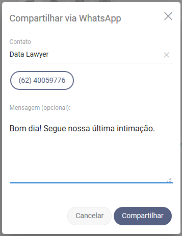Escolha para qual número do cliente deseja enviar a mensagem. Você também pode escrever uma mensagem que irá complementar a informação a ser enviada. Após, clique em compartilhar: