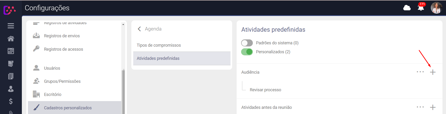 Para criar atividades predefinidas para um compromisso se faz necessário criar primeiro uma lista de atividades predefinidas. Após criar, você pode adicionar quantas atividades deseja vincular a lista, para isso vá no módulo Configurações > Cadastros personalizados > Agenda > Atividades predefinidas.