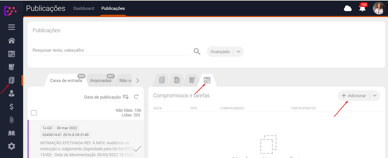 Para criar um compromisso a partir de uma publicação, vá até Publicações > Caixa de entrada > clique na publicação > selecione o ícone > clique em +Adicionar.