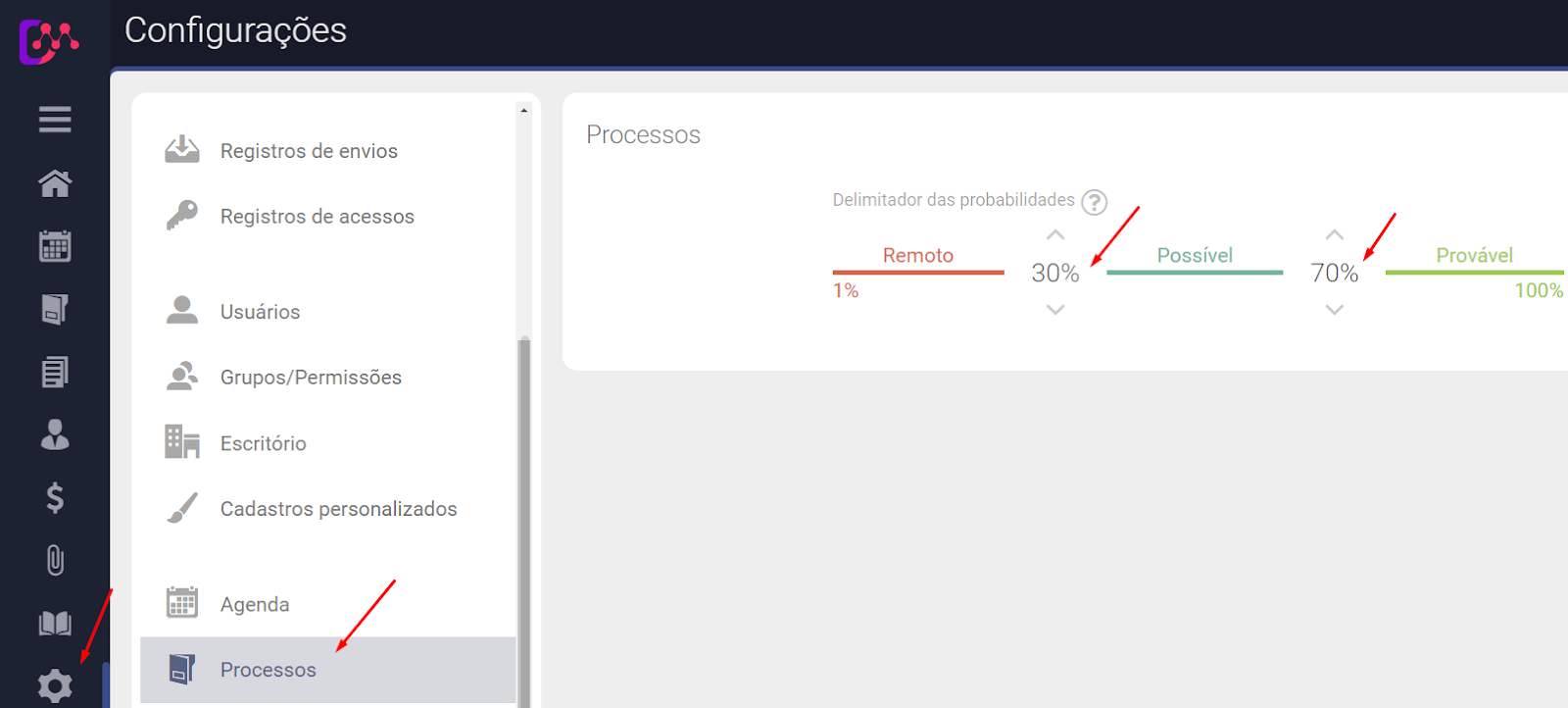 Caso queira alterar os percentuais de êxito ou perda, acesse o menu Configurações > Processos > altere os percentuais e clique em Salvar.