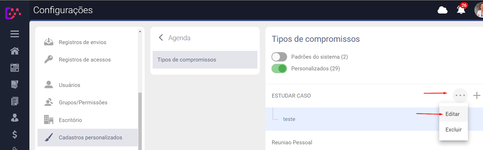 Agenda - Como editar um tipo de compromisso? Para editar um tipo de compromisso vá em Configurações > Cadastros personalizados > Tipos de compromissos. Posicione o mouse sobre o compromisso que deseja alterar, clique no ícone dos três pontos e escolha a opção Editar. Altere o nome e/ou a cor e por fim clique em Concluir.