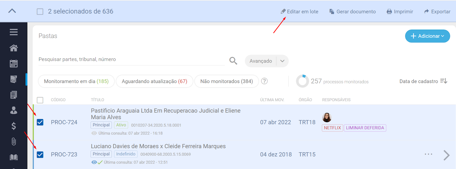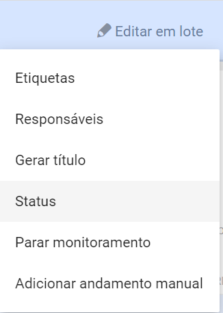 Vá no módulo Processos > Pastas > selecione os processos que deseja alterar o status > uma aba na parte superior da tela será exibida > clique em Editar em lote.